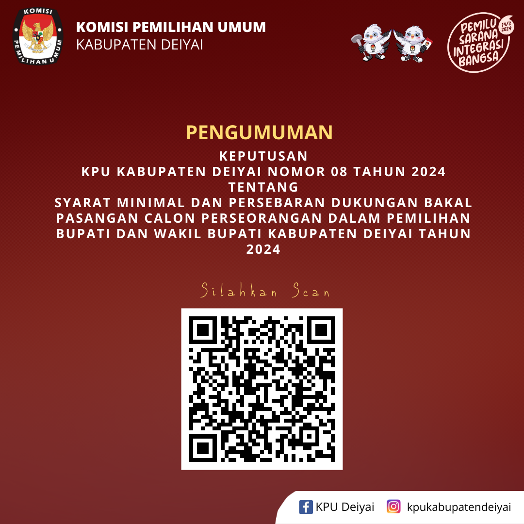 #TemanPemilih, Berikut Keputusan KPU Kabupaten Deiyai Nomor : 08 Tahun 2024 tentang Syarat Miniminal dan Persebaran Dukungan Bakal Calon Perseorangan Dalam Pemilihan Bupati dan Wakil Bupati Kabupaten Deiyai Tahun 2024. Surat Keputusan dapat didownload pada link dibawah ini :