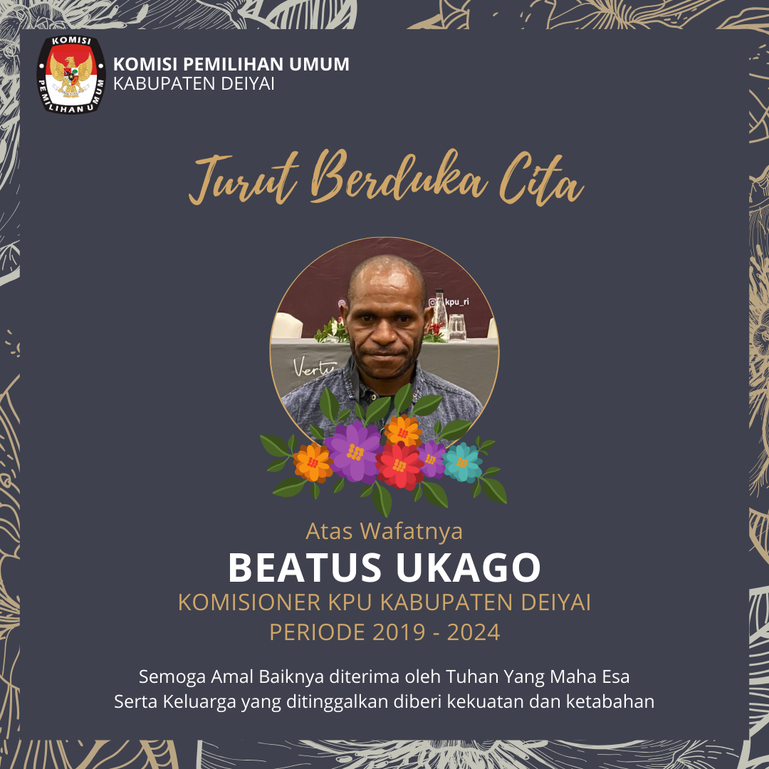 Segenap keluarga besar KPU Kabupaten Deiyai menyampaikan duka yang mendalam atas wafatnya Bapak Beatus Ukago, Komisioner KPU Kabupaten Deiyai 2019-2024. Semoga Amal Baiknya diterima oleh Tuhan Yang Maha Esa. Selamat Jalan Pak Beatus Ukago ???